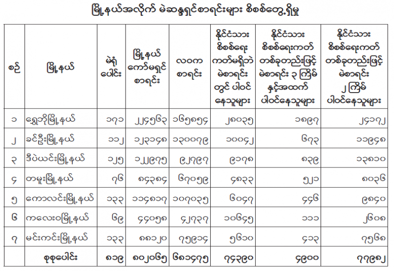 ၁။ ပြည်ထောင်စုရွေးကောက်ပွဲကော်မရှင်သည် ၂၀၂၀ ပြည့်နှစ် နိုဝင်ဘာလ ၈ ရက်နေ့တွင် ကျင်းပ ပြုလုပ်သည့် ပါတီစုံဒီမိုကရေစီအထွေထွေရွေးကောက်ပွဲနှင့်စပ်လျဉ်း၍ စစ်ကိုင်းတိုင်းဒေသကြီး၊ ရွှေဘိုမြို့နယ်၊ ခင်ဦးမြို့နယ်၊ ဒီပဲယင်းမြို့နယ်၊ တမူးမြို့နယ်၊ ကောလင်းမြို့နယ်၊ ကလေးဝမြို့နယ်နှင့် မင်းကင်းမြို့နယ် တို့၏ မဲဆန္ဒရှင်စာရင်းများနှင့် ဆန္ဒမဲလက်မှတ်များ ထုတ်ယူ ရရှိ/ သုံးစွဲ/ လက်ကျန် မြေပြင်အခြေအနေ များကို စစ်ဆေးခဲ့သည်။