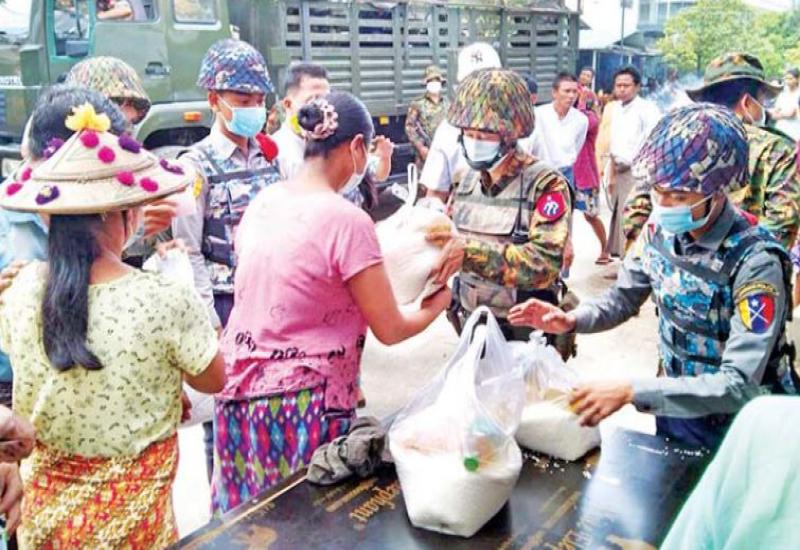 COVID-19 ရောဂါ ကာကွယ်၊ ထိန်းချုပ်ကုသရေး လုပ်ငန်းများဆောင်ရွက်နေစဉ် ကာလအတွင်း သွားလာမှုကန့်သတ်ချက်များကြောင့်ဒေသခံပြည်သူ များ စားရေးအဆင်ပြေစေရန်အတွက် နယ်မြေခံ တပ်မတော်သားများက ဆန်၊ ဆီနှင့် စားသောက် ဖွယ်ရာများကို အိမ်အရောက်လိုက်လံပေးဝေလှူဒါန်း လျက်ရှိသည်။