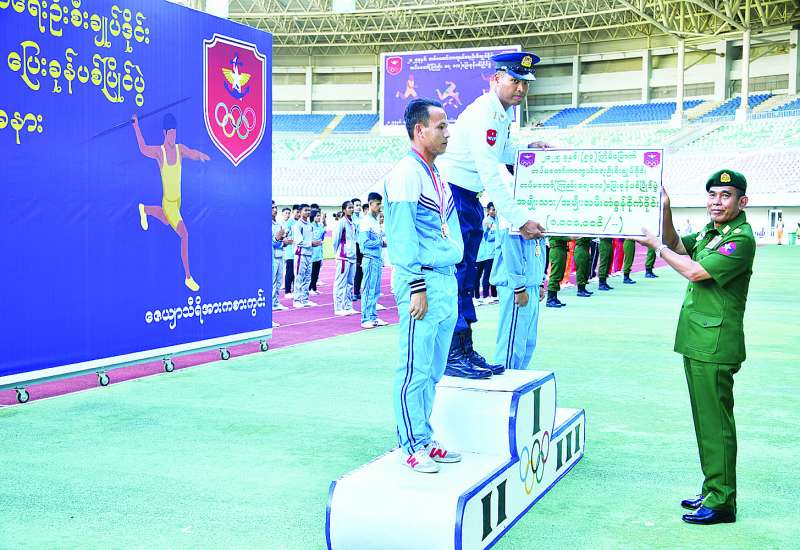တပ်မတော်ကာကွယ်ရေးဦးစီးချုပ်ဒိုင်း တပ်မတော် (ကြည်း၊ ရေ၊ လေ) ပြေး၊ ခုန်၊ ပစ်ပြိုင်ပွဲ ဗိုလ်လုပွဲနှင့် ဆုပေးပွဲကို ယနေ့ညနေပိုင်းတွင် နေပြည်တော်ကောင်စီနယ်မြေ ဇေယျာသီရိတပ်မတော်အားကစားကွင်း၌ ပြုလုပ်ရာ နိုင်ငံတော်လုံခြုံရေးနှင့်အေးချမ်းသာယာရေးကော်မရှင်ဥက္ကဋ္ဌ တပ်မတော်ကာကွယ်ရေးဦးစီးချုပ် ဗိုလ်ချုပ်မှူးကြီး မင်းအောင်လှိုင်ကိုယ်စား တပ်မတော်အားကစားနှင့်ကာယပညာအုပ်ချုပ်ရေးအဖွဲ့ဥက္ကဋ္ဌ စစ်ရေးချုပ် ဒုတိယဗိုလ်ချုပ်ကြီး ဖုန်းမြတ် တက်ရောက်သည်။