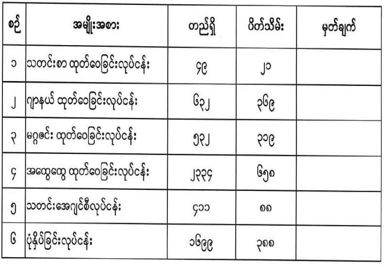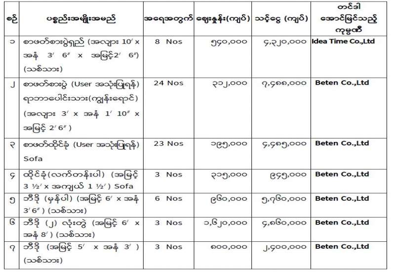 ပုံနှိပ်ရေးနှင့်ထုတ်ဝေရေးဦးစီးဌာနအတွက် ၂ဝ၂၅-၂ဝ၂၆ ဘဏ္ဍာရေးနှစ်၊ ငွေလုံးငွေရင်းအသုံးစရိတ်ဖြင့် ရုံးသုံး/ လုပ်ငန်းသုံးပရိဘောဂပစ္စည်း (၂၉) မျိုးမှ ပစ္စည်း (၂၃)မျိုးအား ဝယ်ယူရန် ပြည်တွင်း/ပြည်ပ ပစ္စည်းများ ဝယ်ယူရေးနှင့်ထုခွဲရောင်းချရေးကော်မတီမှ (၁၄-၈-၂ဝ၂၅) ရက် နံနက် (၁ဝ : ဝဝ) နာရီတွင် စိစစ်ခဲ့သည့် ဈေးနှုန်းများအနက် အနည်းဆုံးပေးသွင်းသည့် အောက်ပါကုမ္ပဏီများမှ ယှဉ်တွဲပါဈေးနှုန်း၊ အရေအတွက်တို့ဖြင့် တင်ဒါအောင်မြင်ကြောင်း ပြန်ကြားရေးဝန်ကြီးဌာန၊ စီမံခန့်ခွဲရေးကော်မတီ အစည်းအဝေးအမှတ်စဉ် (၁၂/၂ဝ၂၅) ဆုံးဖြတ်ချက်အရ ကြေညာအပ်ပါသည်-