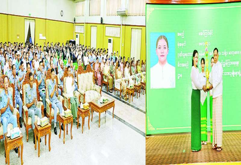 နယ်စပ်ရေးရာဝန်ကြီးဌာန ၂၀၂၄-၂၀၂၅ ပညာသင်နှစ် တက္ကသိုလ်ဝင်စာမေးပွဲတွင် ထူးချွန်စွာ အောင်မြင်ခဲ့ကြသော ဝန်ထမ်းသား သမီးများ၊ အောင်ချက်အကောင်းဆုံးသင်တန်းကျောင်းများ၊ လူရည်ချွန်ဆုရရှိသော ကျောင်းသား ကျောင်းသူများအား ဂုဏ်ပြုဆုချီးမြှင့်ခြင်းအခမ်းအနားကို ယနေ့နံနက်ပိုင်းတွင် နယ်စပ်ရေးရာဝန်ကြီးဌာန ဧရာဝတီခန်းမ၌ ကျင်းပရာ နယ်စပ်ရေးရာဝန်ကြီးဌာန ပြည်ထောင်စုဝန်ကြီး ဒုတိယဗိုလ်ချုပ်ကြီး ရာပြည့်နှင့် ဇနီး၊ ဒုတိယဝန်ကြီး ဗိုလ်ချုပ်ဖြိုးသန့်နှင့် ဇနီး၊ အမြဲတမ်းအတွင်းဝန်နှင့် ဇနီး၊ ညွှန်ကြားရေးမှူးချုပ်များနှင့် ဇနီးများ၊ ဝန်ကြီးရုံးနှင့် ဦးစီးဌာနများမှ အရာထမ်း၊ အမှုထမ်းများ၊ ဆုရကျောင်းသား ကျောင်းသူများနှင့် ၎င်းတို့၏ မိသားစုဝင်များ တက်ရောက်ကြသည်။