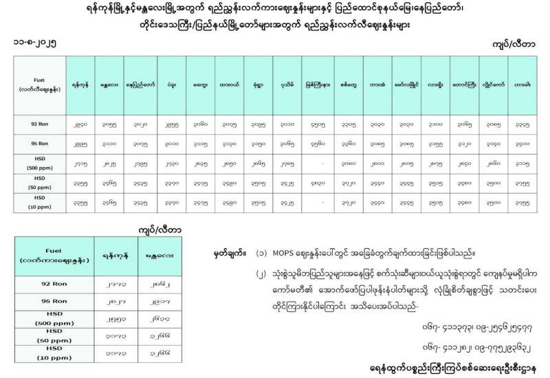 ရန်ကုန်မြို့နှင့် မန္တလေးမြို့အတွက် ရည်ညွှန်းလက်ကားဈေးနှုန်းများနှင့် ပြည်ထောင်စုနယ်မြေ နေပြည်တော်၊ တိုင်းဒေသကြီး/ပြည်နယ် မြို့တော်များအတွက် ရည်ညွှန်းလက်လီဈေးနှုန်းများ