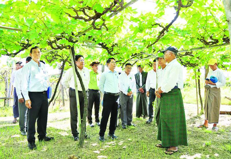 စိုက်ပျိုးရေး၊ မွေးမြူရေးနှင့်ဆည်မြောင်းဝန်ကြီးဌာန ပြည်ထောင်စုဝန်ကြီး ဦးမင်းနောင်သည် ယနေ့နံနက်ပိုင်းတွင် မန္တလေးတိုင်းဒေသကြီး ရမည်းသင်းမြို့နယ် ရွာတန်းကျေးရွာအုပ်စုရှိ စပျစ်စိုက်ခင်းများကို ကွင်းဆင်းကြည့်ရှုစစ်ဆေးပြီး ဒေသခံတောင်သူများနှင့် တွေ့ဆုံသည်။