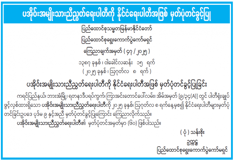 ပအိုဝ်းအမျိုးသားညီညွတ်ရေးပါတီကို နိုင်ငံရေးပါတီအဖြစ် မှတ်ပုံတင်ခွင့်ပြုခြင်း