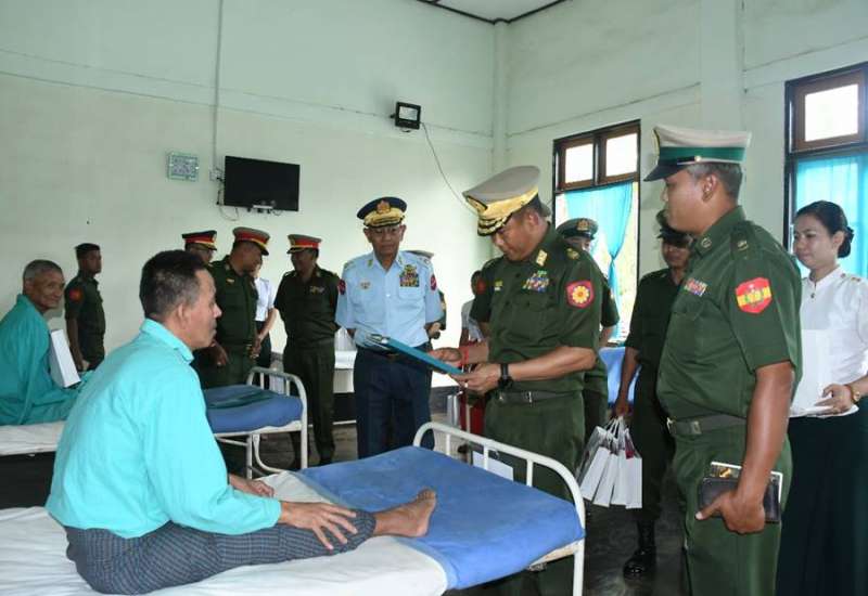 ကချင်ပြည်နယ်၊ မြစ်ကြီးနားမြို့ရှိတပ်မတော်ဆေးရုံ၊ ရှမ်းပြည်နယ်(တောင်ပိုင်း)၊ နမ့်စန်မြို့ရှိ တပ်မတော်ဆေးရုံ၊ တနင်္သာရီတိုင်းဒေသကြီး၊ ဘုတ်ပြင်းမြို့ရှိ တပ်မတော်ဆေးရုံ၊ ရန်ကုန်တိုင်းဒေသကြီး၊ မင်္ဂလာဒုံမြို့နယ်ရှိ တပ်မတော်အရိုးရောဂါ အထူးကုဆေးရုံကြီး(ခုတင်-၅၀၀)နှင့် တပ်မတော်ဆေးရုံကြီး(ခုတင်-၁၀၀၀)၊ ဧရာဝတီတိုင်းဒေသကြီး၊ ပုသိမ်မြို့ရှိ နယ်မြေခံဆေးတပ်ရင်း၊ ရခိုင်ပြည်နယ်၊ စစ်တွေမြို့ရှိတပ်မတော်ဆေးရုံ၊ မန္တလေးတိုင်းဒေသကြီး၊ မန္တလေးမြို့၊ နန်းမြို့တွင်းရှိ တပ်မတော်ဆေးရုံတို့၌ တက်ရောက်ဆေးကုသမှုခံယူလျက်ရှိသော အရာရှိ၊ စစ်သည်၊ မိသားစုဝင်များ၊ မြန်မာနိုင်ငံရဲတပ်ဖွဲ့ဝင်များ၊ ပြည်သူ့စစ်(ဌာနေ)တပ်ဖွဲ့ဝင်များ၊ စစ်မှုထမ်းဟောင်းအဖွဲ့ဝင်များနှင့် ဒေသခံပြည်သူများအား ယနေ့တွင် သက်ဆိုင်ရာတိုင်းစစ်ဌာနချုပ်များမှ တိုင်းမှူးများနှင့် တာဝန်ရှိသူများက သွားရောက်ကြည့်ရှု၍ တစ်ဦးချင်း၏ ရောဂါဖြစ်ပွားမှု၊ ဆေးဝါးကုသပေးထားမှုနှင့် ကျန်းမာရေးတိုးတက်ကောင်းမွန်မှုအခြေအနေများကို မေးမြန်းအားပေးစကား ပြောကြားပြီး အာဟာရဖြည့်စားသောက်ဖွယ်ရာများနှင့် ချီးမြှင့်ငွေများပေးအပ်ကာ ဆရာဝန်၊ သူနာပြုများအား ချီးမြှင့်ငွေများပေးအပ်ကြသည်။