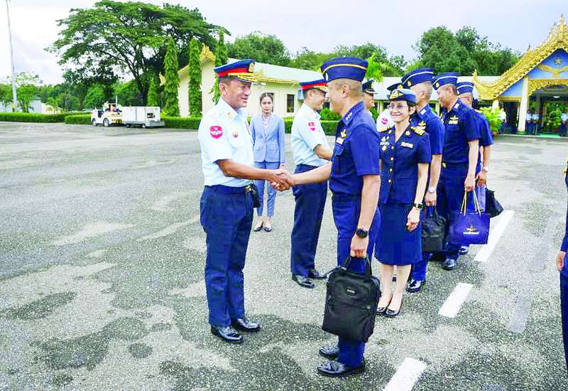 မြန်မာ - ထိုင်း နှစ်နိုင်ငံလေတပ်များအကြား အရာရှိကြီးများ အပြန်အလှန်လည်ပတ်ရေး အစီအစဉ်အရ ထိုင်းဘုရင့်လေတပ်မှ Air Marshal Srit Vuteerapol ဦးဆောင်သော ကိုယ်စားလှယ် အဖွဲ့သည် ဩဂုတ် ၄ ရက်တွင် ရန်ကုန်မြို့ မင်္ဂလာဒုံလေတပ်စခန်းဌာနချုပ်သို့ ရောက်ရှိကြရာ တပ်မတော်(လေ)မှ တာဝန်ရှိသူများက ကြိုဆိုကြသည်။