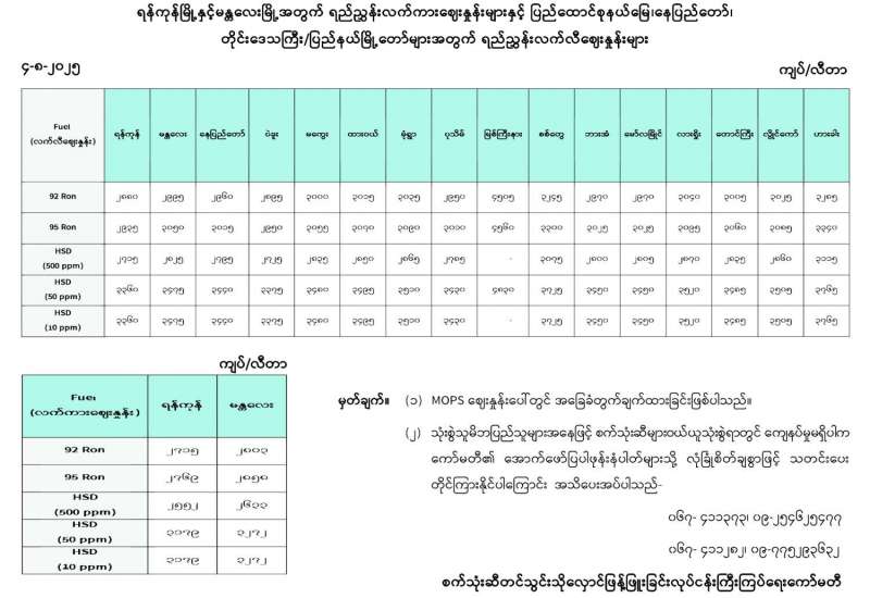 ရန်ကုန်မြို့နှင့် မန္တလေးမြို့အတွက် ရည်ညွှန်းလက်ကားဈေးနှုန်းများနှင့် ပြည်ထောင်စုနယ်မြေ နေပြည်တော်၊ တိုင်းဒေသကြီး/ပြည်နယ် မြို့တော်များအတွက် ရည်ညွှန်းလက်လီဈေးနှုန်းများ