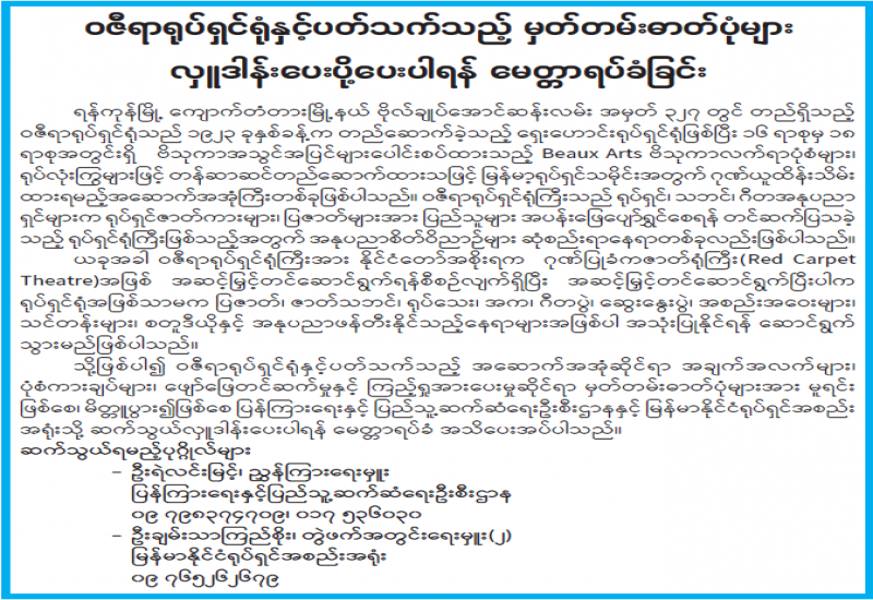 ၁။ အဂတိလိုက်စားမှုတိုက်ဖျက်ရေးဆိုင်ရာ အသိပညာပေးပိုစတာ၊ ပန်းချီနှင့် ဗီဒီယိုပြိုင်ပွဲကို “အဂတိလိုက်စားမှုများတိုက်ဖျက်ဖို့ ပူးပေါင်းဆောင်ရွက်ကြပါစို့” ခေါင်းစဉ်ဖြင့် ကျင်းပပြုလုပ်သွားမည်ဖြစ်ရာ လူငယ်လူရွယ်များ ဝင်ရောက်ယှဉ်ပြိုင်နိုင်ပါကြောင်း ဖိတ်ခေါ်အပ်ပါသည်။