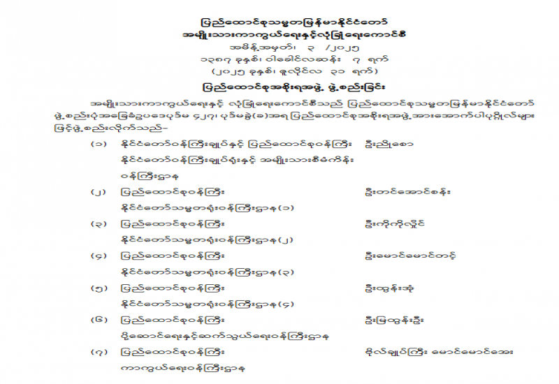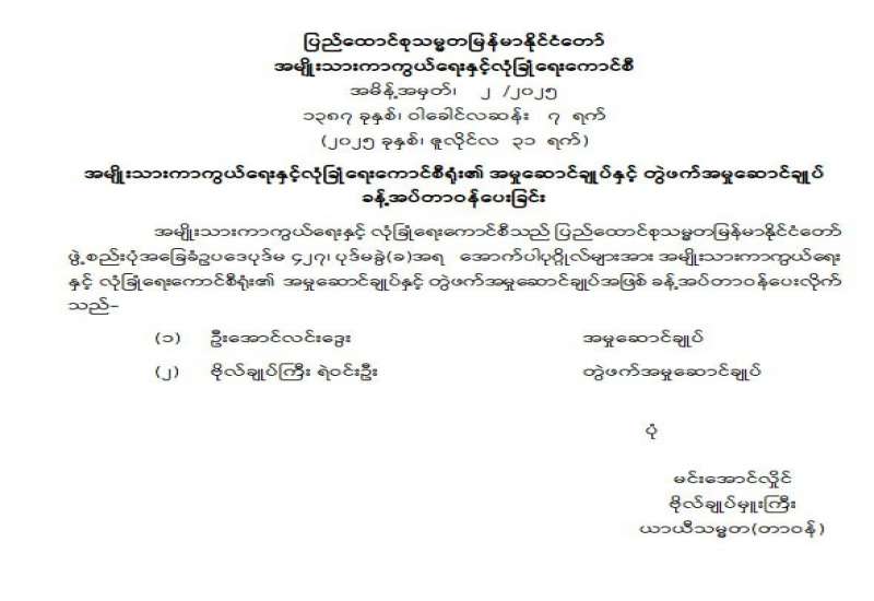 အမျိုးသားကာကွယ်ရေးနှင့် လုံခြုံရေးကောင်စီရုံး၏ အမှုဆောင်ချုပ်နှင့် တွဲဖက်အမှုဆောင်ချုပ် ခန့်အပ်တာဝန်ပေးခြင်း