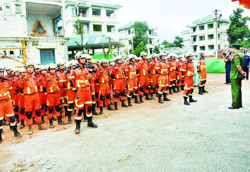 မြို့ပြရှာဖွေကယ်ဆယ်ရေးအဖွဲ့ (Medium Urban Search and Rescue Team) ဖွဲ့စည်းရန်ရည်ရွယ်၍ မေ ၁၂ ရက်မှ ဩဂုတ် ၁ ရက်အထိရက်သတ္တ ၁၂ ပတ်ကြာ စုဖွဲ့လေ့ကျင့်လျက်ရှိသော ပြည်ထဲရေးဝန်ကြီးဌာန၊ မီးသတ်ဦးစီးဌာနမှ အထူးရှာဖွေကယ်ဆယ်ရေးတပ်ဖွဲ့ဝင် ၁၀၀ တို့သည် ယမန်နေ့က ဇမ္ဗူသီရိမြို့နယ် ဗလသိဒ္ဓိရပ်ကွက်၌ ငလျင်ဘေးအန္တရာယ်ဆိုင်ရာ လက်တွေ့ကယ်ဆယ်ရေးလေ့ကျင့်ခန်းများ ပြုလုပ်ဆောင်ရွက်ခဲ့ရာ ပြည်ထောင်စုဝန်ကြီး ဒုတိယဗိုလ်ချုပ်ကြီး ထွန်းထွန်းနောင် တက်ရောက်ကြည့်ရှုအားပေးပြီး လိုအပ်သည်များမှာကြားကာ ဂုဏ်ပြုဆုငွေများချီးမြှင့်ပေးအပ်ခဲ့သည်။