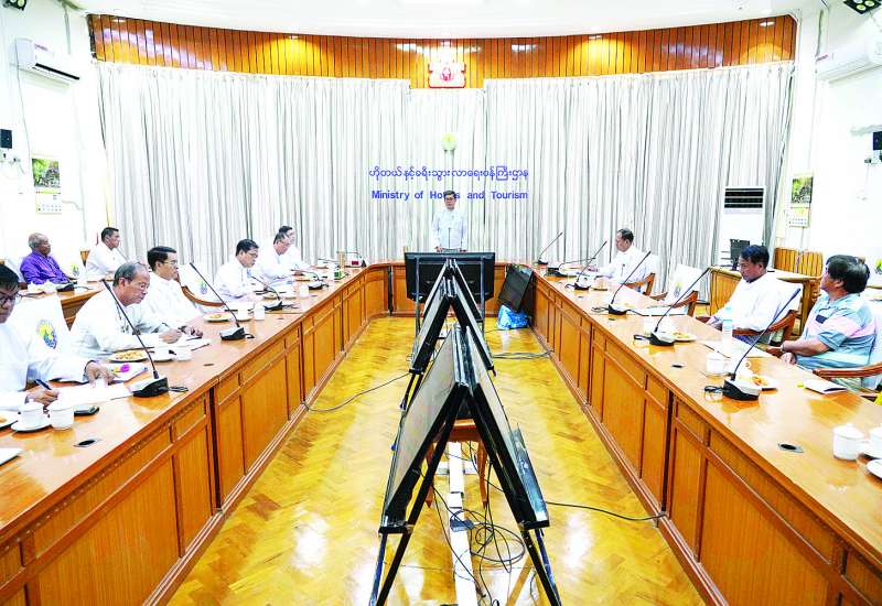 ဟိုတယ်နှင့်ခရီးသွားလာရေးဝန်ကြီးဌာန ပြည်ထောင်စုဝန်ကြီး ဦးကျော်စိုးဝင်းသည် နေပြည်တော် ဟိုတယ်ဇုန်(၂)ဥတ္တရသီရိ မြို့နယ်ရှိဟိုတယ်များမှ လုပ်ငန်းရှင်များ၊ အထွေထွေမန်နေဂျာများနှင့် တာဝန်ရှိသူများအား ယနေ့နံနက်ပိုင်းတွင် ဟိုတယ်နှင့်ခရီးသွားလာရေးဝန်ကြီးဌာန နီလာခန်းမ၌ တွေ့ဆုံသည်။