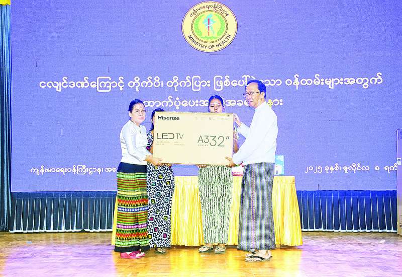 ကျန်းမာရေးဝန်ကြီးဌာန ဝန်ထမ်းမိသားစုများအနက် နေပြည်တော်ကောင်စီနယ်မြေ၌ မန္တလေးငလျင်ကြီးကြောင့် မြေညီထပ်အခန်းများပျက်စီးခဲ့သည့် ကျန်းမာရေးဝန်ထမ်းမိသားစုများ အခြေခံလိုအပ်သည့် အိမ်သုံးလျှပ်စစ်ပစ္စည်းများ ထောက်ပံ့ပေးအပ်ခြင်းအခမ်းအနားကို ယမန်နေ့ မွန်းလွဲပိုင်းတွင် နေပြည်တော်ကျန်းမာရေးဝန်ကြီးဌာန ရုံးအမှတ် (၄) အစည်းအဝေးခန်းမ၌ ကျင်းပသည်။