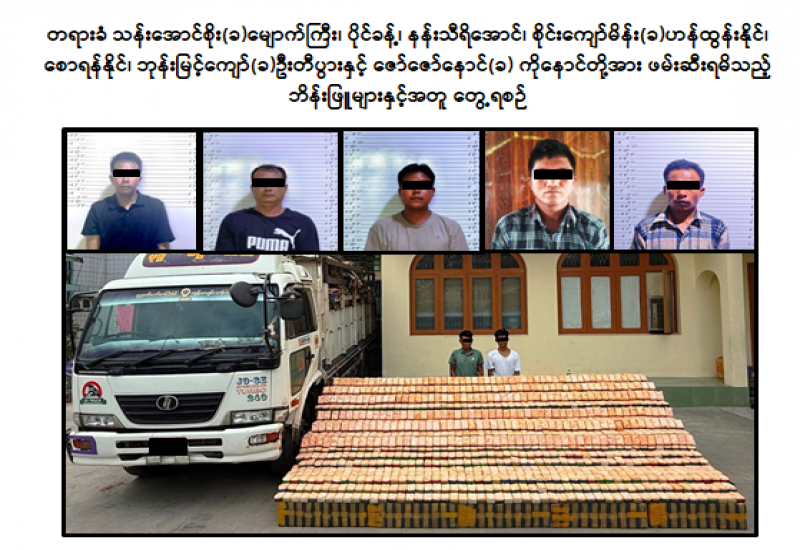 မူးယစ်ဆေးဝါးတားဆီးနှိမ်နင်းရေးရဲတပ်ဖွဲ့မှ တပ်ဖွဲ့ဝင်များပါဝင်သောပူးပေါင်းအဖွဲ့သည် ဇွန်လ ၂၂ ရက်နေ့ညနေ ၃ နာရီတွင် ကျောက်ဆည်နှင့်မိတ္ထီလာ ခရိုင်ချင်းဆက်လမ်း၊ တောင်တော်ကျေးရွာအနီး၌ သတင်းအရစောင့်ဆိုင်းနေစဉ် ရှမ်းပြည်နယ် (မြောက်ပိုင်း) မိုင်းရယ်မှ မန္တလေးသို့ သန်းအောင်စိုး(ခ)မျောက်ကြီး မောင်းနှင်ပြီး ပိုင်ခန့် လိုက်ပါလာသည့် NISSAN DIESEL ၆ ဘီး မော်တော်ယာဉ်အား စစ်ဆေးရှာဖွေရာ ယာဉ်ပေါ်မှ ဘိန်းဖြူ ၁၄၈ ဒသမ ၇၉၇ ကီလို ဖမ်းဆီးရမိခဲ့ကြောင်း သိရှိရသည်။
