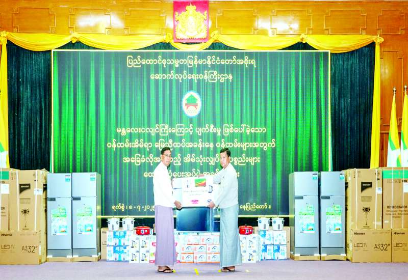 ဆောက်လုပ်ရေးဝန်ကြီးဌာန ဝန်ထမ်းမိသားစုများထဲမှ နေပြည်တော်ကောင်စီနယ်မြေတွင် မန္တလေးငလျင်ကြီးကြောင့် မြေညီထပ်အခန်းများ ပျက်စီးခဲ့သည့် ဝန်ထမ်းမိသားစုများ အခြေခံလိုအပ်သည့် အိမ်သုံးလျှပ်စစ်ပစ္စည်းများ ထောက်ပံ့ပေးအပ်ခြင်းအခမ်းအနားကို ယနေ့မွန်းလွဲပိုင်းတွင် နေပြည်တော် ဆောက်လုပ်ရေးဝန်ကြီးဌာန ရုံးအမှတ် (၁၁) စုဝေးခန်းမ၌ ကျင်းပသည်။