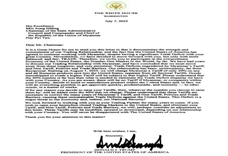 အမေရိကန်သမ္မတ ဒေါ်နယ်ထရမ့်က မြန်မာ၊ ဂျပန်၊ တောင်ကိုရီးယား၊ မလေးရှား၊ ကာဇက်စတန်၊ တူနီးရှား၊ ဘော့စနီးယား ဟာဇီဂိုးဗီးနား၊ တောင်အာဖရိက၊ အင်ဒိုနီးရှား၊ ဘင်္ဂလားဒေ့ရှ်၊ ဆားဘီးယား၊ ကမ္ဘော ဒီးယား၊ ထိုင်း၊ လာအိုနှင့် စုစုပေါင်း နိုင်ငံ ၁၄ နိုင်ငံအား သွင်းကုန်ခွန် တိုးမြှင့်စည်းကြပ်ထားမှုနှင့်ပတ်သက်၍ ဇူလိုင် ၇ ရက်နေ့တွင် သက်ဆိုင်ရာနိုင်ငံများသို့ သဝဏ်လွှာ/ အကြောင်းကြားစာများ ပေးပို့ခဲ့ကြောင်း သိရှိရသည်။