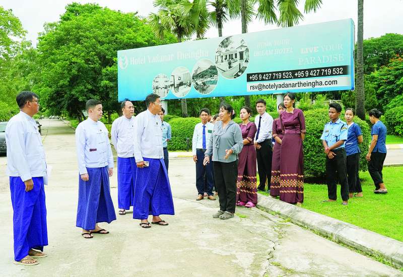 ဟိုတယ်နှင့်ခရီးသွားလာရေးဝန်ကြီးဌာန ပြည်ထောင်စုဝန်ကြီး ဦးကျော်စိုးဝင်းသည် ဒုတိယဝန်ကြီး ဦးဖြိုးဇော်စိုး၊ အမြဲတမ်းအတွင်းဝန်၊ တာဝန်ရှိသူများနှင့်အတူ ပြည်ထောင်စုနယ်မြေ နေပြည်တော်ရှိ ဟိုတယ်များ သန့်ရှင်းသာယာလှပမှုရှိစေရေးနှင့် ငလျင်ကြောင့် ထိခိုက်ပျက်စီးမှုများကို ပြန်လည်ပြုပြင်မွမ်းမံဆောင်ရွက်ထားရှိမှုတို့ကို လှည့်လည်ကြည့်ရှုစစ်ဆေးသည်။