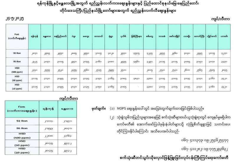 ရန်ကုန်မြို့နှင့် မန္တလေးမြို့အတွက် ရည်ညွှန်းလက်ကားဈေးနှုန်းများနှင့် ပြည်ထောင်စုနယ်မြေ နေပြည်တော်၊ တိုင်းဒေသကြီး/ပြည်နယ် မြို့တော်များအတွက် ရည်ညွှန်းလက်လီဈေးနှုန်းများ