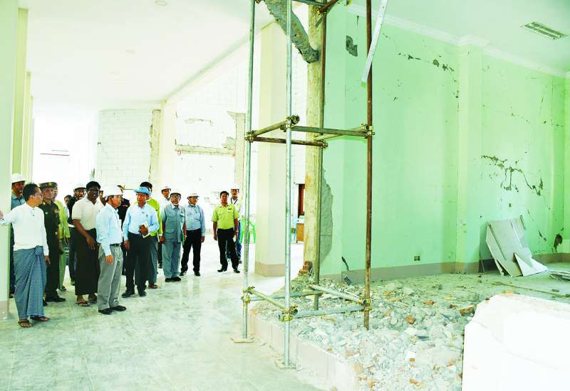 နေပြည်တော်ကောင်စီဥက္ကဋ္ဌ ဦးသန်းထွန်းဦးသည် ယမန်နေ့ ညနေပိုင်းက နေပြည်တော်စည်ပင်သာယာရေးကော်မတီ ဒုတိယမြို့တော်ဝန်နှင့်အတူ ငလျင်ဘေးဒဏ်ကြောင့် ထိခိုက်ပျက်စီးခဲ့သည့် နေပြည်တော်စည်ပင်သာယာရေးကော်မတီ၊ မြို့တော်ခန်းမအဆောက်အအုံ ပြန်လည်ပြုပြင်နေမှုအခြေအနေများကို ကြည့်ရှုစစ်ဆေးပြီး ထိခိုက်ပျက်စီးသည့် အစိတ်အပိုင်းများအား စနစ်တကျဖယ်ရှားရှင်းလင်းရေး၊ သတ်မှတ်စံချိန်စံညွှန်းများနှင့်အညီ လုပ်ငန်းများ အမြန်ပြီးစီးအောင် ပြုပြင်ဆောင်ရွက်ရေးတို့ကို မှာကြားသည်။