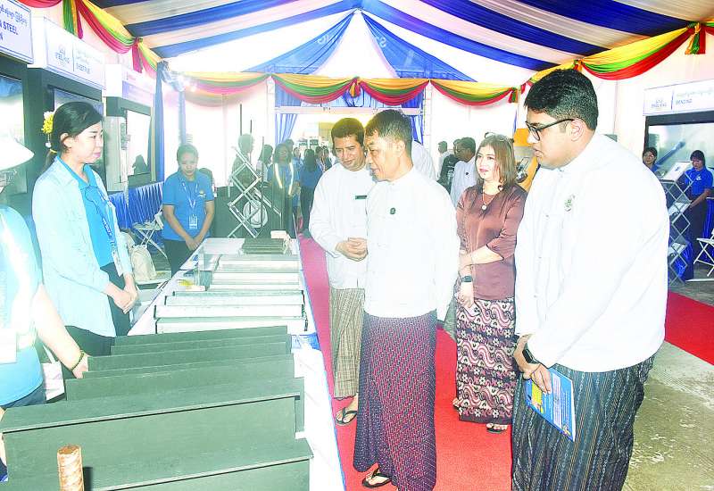 စီးပွားရေးနှင့်ကူးသန်းရောင်းဝယ်ရေးဝန်ကြီးဌာန ပြည်ထောင်စုဝန်ကြီး ဦးထွန်းအုံသည် ယနေ့နံနက်ပိုင်းတွင် မန္တလေးငလျင်ကြီးလှုပ်ခတ်ခဲ့ပြီးနောက် ပြန်လည်ထူထောင်ရေးလုပ်ငန်းစဉ်များ ဆောင်ရွက်ရာတွင် လိုအပ်သည့် သံ၊ သံမဏိ၊ ဘိလပ်မြေနှင့် ဆောက်လုပ်ရေးလုပ်ငန်းသုံးပစ္စည်းများကို အများပြည်သူများ ဈေးနှုန်းမှန်ကန်စွာနှင့် အရည်အသွေးပြည့်မီစွာ ဝယ်ယူနိုင်ရေး ရည်ရွယ်၍ နေပြည်တော် ဥပ္ပါတသန္တိစေတီတော်တပေါင်းကွင်း၌ ကျင်းပပြုလုပ်လျက်ရှိသည့် သံ၊ သံမဏိ၊ ဘိလပ်မြေနှင့် ဆောက်လုပ်ရေးလုပ်ငန်းသုံးပစ္စည်းများ ရောင်းချပေးလျက်ရှိသည့် အရောင်းပြခန်းများကို လှည့်လည်ကြည့်ရှုအားပေးသည်။