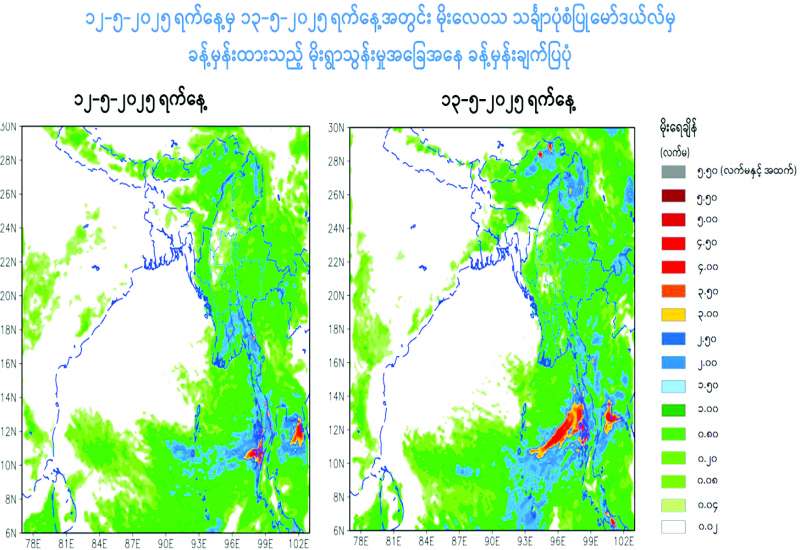 ယနေ့ညနေ ၄ နာရီခွဲ တိုင်းထွာချက်များအရ ကပ္ပလီပင်လယ်ပြင်နှင့် ဘင်္ဂလားပင်လယ်အော်တောင်ပိုင်းတို့တွင် လေထုမငြိမ်မသက်မှုများ ဖြစ်ပေါ်လာနိုင်ခြင်းကြောင့် လည်းကောင်း၊ မုတ်သုံလေဝင်ရောက်လာနိုင်ခြင်းကြောင့်လည်းကောင်း၊ အပူပြန်တက်တိမ်များဖြစ်ထွန်းမှုအားကောင်းခြင်းကြောင့်လည်းကောင်း ယနေ့ညနေမှ မေ ၁၉ ရက် အတွင်း နေပြည်တော်၊ ရန်ကုန်တိုင်းဒေသကြီး၊ မန္တလေးတိုင်းဒေသကြီး၊ ပဲခူးတိုင်းဒေသကြီး၊ မကွေးတိုင်းဒေသကြီး၊ စစ်ကိုင်းတိုင်းဒေသကြီး၊ ဧရာဝတီတိုင်းဒေသကြီး၊ တနင်္သာရီတိုင်းဒေသကြီး၊ ကချင်ပြည်နယ်၊ ကယားပြည်နယ်၊ ကရင်ပြည်နယ်၊ ချင်းပြည်နယ်၊ မွန်ပြည်နယ်၊ ရခိုင်ပြည်နယ်နှင့် ရှမ်းပြည်နယ်တို့တွင် နေရာစိပ်စိပ်မှ နေရာအနှံ့အပြား မိုးထစ်ချုန်းရွာပြီး အချို့ဒေသများတွင် ဒေသအလိုက်နှင့် နေရာကွက်၍ မိုးကြီးနိုင်သည်။