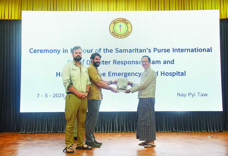 ကျန်းမာရေးဝန်ကြီးဌာန ပြည်ထောင်စုဝန်ကြီး ဒေါက်တာသက်ခိုင်ဝင်းသည် ယနေ့တွင် အမျိုးသားသဘာဝဘေးအန္တရာယ်စီမံခန့်ခွဲမှု ကော်မတီဥက္ကဋ္ဌ၏ကိုယ်စား အရေးပေါ်ကျန်းမာရေးစောင့်ရှောက်မှုလုပ်ငန်းများ ပြီးဆုံး၍ ပြန်လည်ထွက်ခွာမည့် အမေရိကန်အခြေစိုက် Samaritan’s Purse International Relief ဆေးအဖွဲ့အား ဂုဏ်ပြုနှုတ်ဆက်ပွဲနှင့် အရေးပေါ်ဆေးရုံ၊ ဆေးနှင့် ဆေးပစ္စည်းများ လှူဒါန်းပွဲအခမ်းအနားသို့ တက်ရောက်သည်။