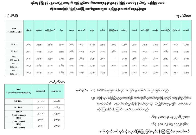 ရန်ကုန်မြို့နှင့် မန္တလေးမြို့အတွက် ရည်ညွှန်းလက်ကားဈေးနှုန်းများနှင့် ပြည်ထောင်စုနယ်မြေ နေပြည်တော်၊ တိုင်းဒေသကြီး/ပြည်နယ် မြို့တော်များအတွက် ရည်ညွှန်းလက်လီဈေးနှုန်းများ