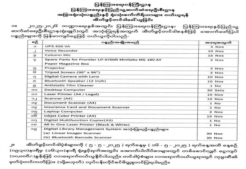 ပြန်ကြားရေးဝန်ကြီးဌာန ပြန်ကြားရေးနှင့်ပြည်သူ့ဆက်ဆံရေးဦးစီးဌာန အခြားရုံးသုံးပစ္စည်းနှင့် ရုံးသုံးစက်ကိရိယာများ ဝယ်ယူရန် အိတ်ဖွင့်တင်ဒါခေါ်ယူခြင်း