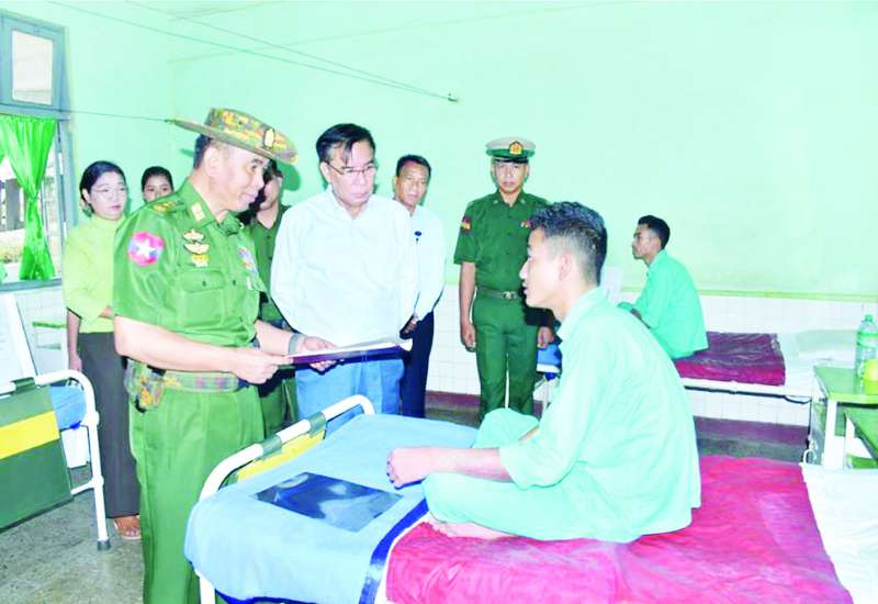 ပဲခူးတိုင်းဒေသကြီး ပြည်မြို့ရှိ တပ်မတော်ဆေးရုံ၌ တက်ရောက်ကုသမှုခံယူလျက်ရှိသော အရာရှိ၊ စစ်သည်၊ မိသားစုများနှင့် ဒေသခံ ပြည်သူများအား ယနေ့ နံနက်ပိုင်းတွင် တိုင်းဒေသကြီး ဝန်ကြီးချုပ် ဦးမျိုးဆွေဝင်း၊ ကာကွယ်ရေးဦးစီးချုပ်ရုံး (ကြည်း) မှ ဒုတိယဗိုလ်ချုပ်ကြီး ဖုန်းမြတ်၊ တောင်ပိုင်းတိုင်း စစ်ဌာနချုပ် ဒုတိယတိုင်းမှူး ဗိုလ်မှူးချုပ် အောင်ခိုင်ချိုနှင့် တာဝန်ရှိသူများက သွားရောက်ကြည့်ရှု၍ ကျန်းမာရေးတိုးတက် ကောင်းမွန်မှုအခြေအနေများကို မေးမြန်းအားပေးစကားပြောကြားပြီး အာဟာရဖြည့်စားသောက်ဖွယ်ရာများနှင့် ချီးမြှင့်ငွေများ ပေးအပ်သည်။