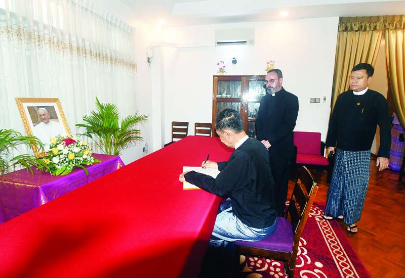 ပုပ်ရဟန်းမင်းကြီး ဖရန်စစ်သည် ဧပြီ ၂၁ ရက်တွင် ကွယ်လွန်သွားခဲ့ခြင်းအတွက် အမှတ် ၄၆ (စီ) အောင်တော်မူလမ်းသွယ် သံလွင်လမ်း ရွှေတောင်ကြား ဗဟန်းမြို့နယ် ရန်ကုန်မြို့ရှိ မြန်မာနိုင်ငံဆိုင်ရာ ဟိုလီဆီး (ဗာတီကန်မြို့ပြနိုင်ငံ) သံရုံးတွင် ဖွင့်လှစ်ထားရှိသော ဝမ်းနည်းကြောင်းမှတ်တမ်းစာအုပ်တွင် ပြည်ထောင်စုသမ္မတမြန်မာနိုင်ငံအစိုးရကိုယ်စား နိုင်ငံတော်စီမံအုပ်ချုပ်ရေးကောင်စီဥက္ကဋ္ဌရုံးဝန်ကြီးဌာန (၂) ပြည်ထောင်စုဝန်ကြီး ဦးကိုကိုလှိုင်သည် ယနေ့ မွန်းလွဲ ၁ နာရီတွင် သွားရောက်လက်မှတ်ရေးထိုးသည်။