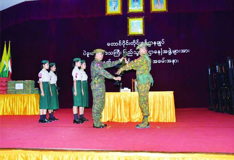 ပဲခူးတိုင်းဒေသကြီး တပ်နယ်များအလိုက် အသစ်ဖွဲ့စည်းထားရှိသည့် ပြည်သူ့စစ်(ဌာနေ)တပ်ဖွဲ့ဝင်များအား လက်နက်တပ်ဆင်အပ်နှင်းခြင်းကို ယနေ့နံနက်ပိုင်းတွင် တောင်ပိုင်းတိုင်းစစ်ဌာနချုပ်၊ အေးချမ်းဖြိုးခန်းမ၌ပြုလုပ်ရာ ကာကွယ်ရေးဦးစီးချုပ်ရုံး(ကြည်း)မှ ဒုတိယဗိုလ်ချုပ်ကြီး ဖုန်းမြတ်၊ တောင်ပိုင်းတိုင်းစစ်ဌာနချုပ် တိုင်းမှူး ဗိုလ်ချုပ်ကြည်သိုက်နှင့် တာဝန်ရှိသူများ တက်ရောက်ကြသည်။