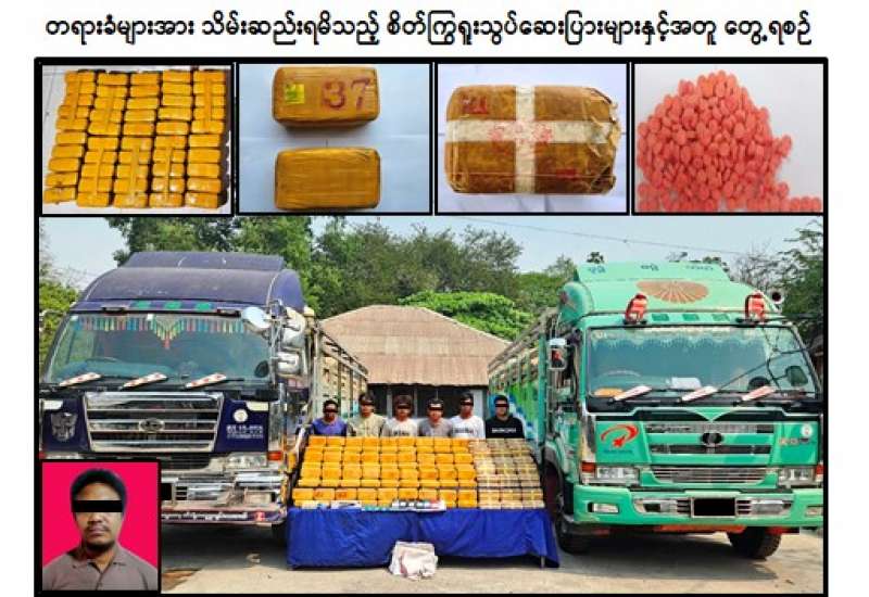 မူးယစ်ဆေးဝါးတားဆီးနှိမ်နင်းရေးရဲတပ်ဖွဲ့မှ တပ်ဖွဲ့ဝင်များပါဝင်သောပူးပေါင်းအဖွဲ့သည် မတ်လ ၁၄ ရက်နေ့ ညနေ ၄ နာရီခွဲအချိန် မန္တလေးတိုင်းဒေသကြီး၊ ပြည်ကြီးတံခွန်မြို့ နယ်၊ ၁၃၄ လမ်းနှင့် ၇၈ လမ်းထောင့်၌ အောင်နိုင်ထွေး(ခ)ဖိုးသား မောင်းနှင်ပြီး ရဲလင်းဖြိုး လိုက်ပါလာသည့် NISSAN ၁၂ ဘီးမော်တော်ယာဉ်နှင့် နန်းလင်းမောင်းနှင်ပြီး ရဲဝင်းထက်လိုက်ပါလာသည့် NISSAN ၁၂ ဘီး မော်တော်ယာဉ်တို့ကို သတင်းအရရှာဖွေရာ အဆိုပါယာဉ် ၂ စီးပေါ်တွင် ကုန်ပစ္စည်းများဖြင့် ဖုံးအုပ်သယ်ဆောင်လာသည့် စိတ်ကြွရူးသွပ်ဆေးပြား ၁၀ ဒသမ ၁ သိန်း သိမ်းဆည်းရမိခဲ့ကြောင်း၊ ဆက်လက်၍ ယင်းနေ့ ည ၁၁ နာရီခွဲအချိန် စိတ်ကြွရူးသွပ်ဆေးပြားများ သယ်ဆောင်ရာ၌ ပူးပေါင်းပါဝင်သူများဖြစ်သည့် စိုးသီဟနှင့် အောင်ဖြိုးကိုတို့အား အမရပူရမြို့နယ်၊ စွယ်တော်ကားဝင်းတွင် ဖမ်းဆီးရမိခဲ့ပြီး မတ်လ ၁၅ ရက်နေ့ နံနက် ၁ နာရီအချိန် ပြည်ကြီးတံခွန်မြို့နယ်၊ စက်မှုကွက်သစ်၊ ၁၄၀(B)လမ်း၊ ၅၅ x ၅၆ လမ်းကြားရှိနေအိမ်တွင် ၎င်းတို့ ၂ ဦး ဝှက်သိမ်းထားသည့် စိတ်ကြွရူးသွပ် ဆေးပြား ၅ သိန်း ထပ်မံသိမ်းဆည်းရမိခဲ့သဖြင့် စုစုပေါင်းဒေသကာလတန်ဖိုးငွေကျပ် ၂ ဒသမ ၂ ဘီလီယံကျော်တန်ဖိုးရှိ စိတ်ကြွရူးသွပ်ဆေးပြား ၁၅ ဒသမ ၁ သိန်း သိမ်းဆည်းရမိခဲ့ကြောင်း၊ စစ်ဆေးဖော်ထုတ်ချက်အရ ယင်းနေ့နံနက် ၆ နာရီခွဲအချိန် စိတ်ကြွရူးသွပ်ဆေးပြားများအား မန္တလေးတိုင်းဒေသကြီး၊ အမရပူရမြို့နယ်မှ စစ်ကိုင်းတိုင်းဒေသကြီး၊ ကလေးမြို့သို့သယ်ဆောင်ရန် စေခိုင်းသူ ဇော်မင်းထွန်း(ခ)ကိုဇော်(ခ)ပုံတူအား စစ်ကိုင်းတိုင်းဒေသကြီး၊ ကလေးမြို့၊ ပင်လုံရပ်ကွက်ရှိ ၎င်း၏နေအိမ်တွင် ဆက်လက်ဖမ်းဆီးရမိခဲ့ပြီး စစ်ဆေးဖော်ထုတ်ချက်များအရ သိမ်းဆည်းရမိ စိတ်ကြွရူးသွပ်ဆေးပြားများအား ရှမ်းပြည်နယ်မှ စစ်ကိုင်းတိုင်းဒေသကြီးသို့ သယ်ဆောင်ရောင်းဝယ်ခြင်းဖြစ်ကြောင်း သိရှိရသဖြင့် ၎င်းတို့အား မူးယစ်ဆေးဝါးနှင့်စိတ်ကိုပြောင်းလဲစေသော ဆေးဝါးများဆိုင်ရာဥပဒေအရ အရေးယူထားရှိပြီး ကွင်းဆက်ပြစ်မှုကျူးလွန်သူများအား ဆက်လက်ဖော်ထုတ်လျက်ရှိကြောင်း မြန်မာနိုင်ငံရဲတပ်ဖွဲ့မှ သတင်းရရှိသည်။