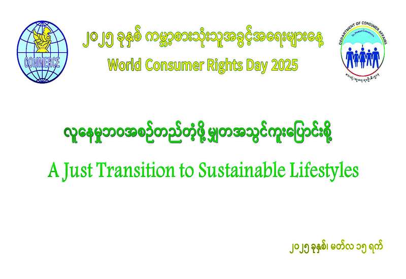 စီးပွားရေးနှင့်ကူးသန်းရောင်းဝယ်ရေးဝန်ကြီးဌာန စားသုံးသူရေးရာဦးစီးဌာန ရန်ကုန်တိုင်းဒေသကြီး ဦးစီးမှူးရုံးကကြီးမှူးကျင်းပသည့် ၂၀၂၅ ခုနှစ် ကမ္ဘာ့စားသုံးသူအခွင့်အရေးများနေ့ (World Consumer Rights Day) အခမ်းအနားကို “လူနေမှုဘဝ အစဉ်တည်တံ့ဖို့ မျှတအသွင် ကူးပြောင်းစို့” ဆောင်ပုဒ်နှင့်အညီ ယနေ့နံနက် ၁၀ နာရီတွင် ရန်ကုန်မြို့ မြန်မာနိုင်ငံကုန်သည်များနှင့် စက်မှုလက်မှုလုပ်ငန်းရှင်များ အသင်းချုပ်မင်္ဂလာခန်းမ၌ ကျင်းပသည်။