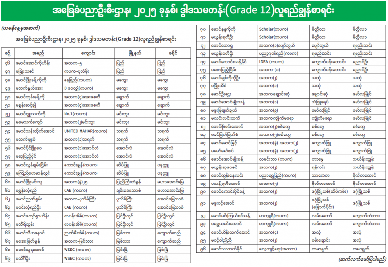 အခြေခံပညာဦးစီးဌာန၊ ၂၀၂၅ ခုနှစ်၊ ဒွါဒသမတန်း(Grade 12)လူရည်ချွန်စာရင်း