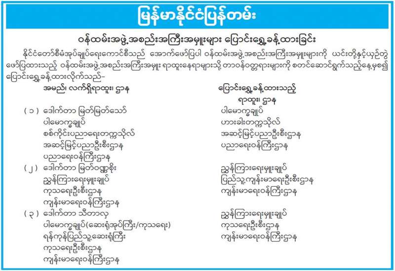 ၁။ ပြန်ကြားရေးဝန်ကြီးဌာနအနေဖြင့် ပုံနှိပ်ခြင်းနှင့်ထုတ်ဝေခြင်းလုပ်ငန်းနည်းဥပဒေများ ထွက်ရှိသည့် ၁၀-၁၀-၂၀၁၄ ရက်နေ့မှစ၍ ပုံနှိပ်ခြင်း၊ ထုတ်ဝေခြင်းနှင့် သတင်းအေဂျင်စီလုပ်ငန်း အသိအမှတ်ပြုလက်မှတ်များအား ၅ နှစ် သက်တမ်းခွင့်ပြုပေးခဲ့ပါသည်။