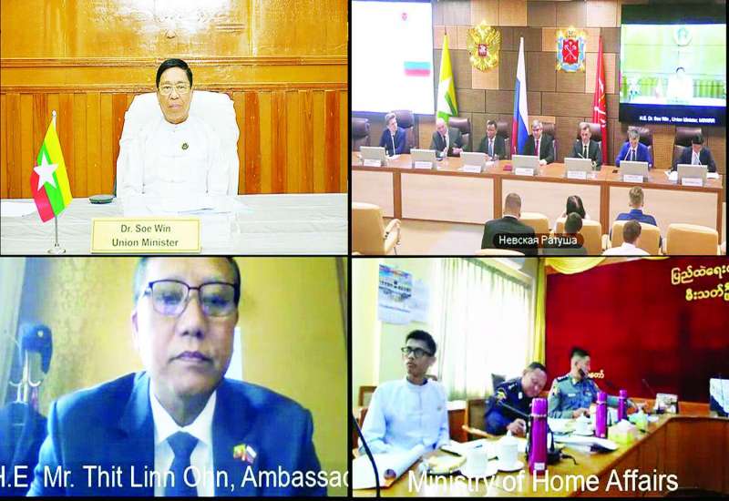 ရုရှားဖက်ဒရေးရှင်းနိုင်ငံနှင့် မြန်မာနိုင်ငံတို့အကြား သံတမန်ဆက်ဆံရေး (၇၇) နှစ်မြောက် အထိမ်းအမှတ်အဖြစ် သဘာဝဘေးအန္တရာယ် ကြိုတင်ပြင်ဆင်ရေးနှင့် အရေးပေါ်တုံ့ပြန်ရေးဆိုင်ရာဆွေးနွေးပွဲကို ရုရှားနိုင်ငံ စိန့်ပီတာစဘတ်မြို့၌ ယနေ့မွန်းလွဲပိုင်းတွင် ကျင်းပပြုလုပ်ရာ လူမှုဝန်ထမ်း၊ ကယ်ဆယ်ရေးနှင့်ပြန်လည်နေရာချထားရေးဝန်ကြီးဌာန ပြည်ထောင်စုဝန်ကြီး ဒေါက်တာစိုးဝင်းသည် Video Conferening စနစ်ဖြင့် ပါဝင်တက်ရောက်၍ အမှာစကားပြောကြားသည်။