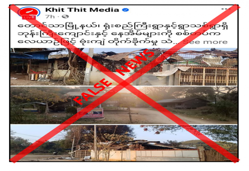စစ်ကိုင်းတိုင်းဒေသကြီး မြောင်မြို့နယ် မြစ်ဆုံရွာကို ဖေဖော်ဝါရီ ၃ ရက်နေ့တွင် လုံခြုံရေးတပ်ဖွဲ့ဝင်များက လေကြောင်းမှ ဗုံးကြဲခဲ့သည့်အတွက် နေအိမ်နှစ်လုံးပျက်စီးခဲ့ကြောင်း တရားမဝင်ပြည်ဖျက်မီဒီယာများက မဟုတ်မမှန်ရေးသားဖြန့်ဝေနေသည်ကို တွေ့ရှိရသည်။