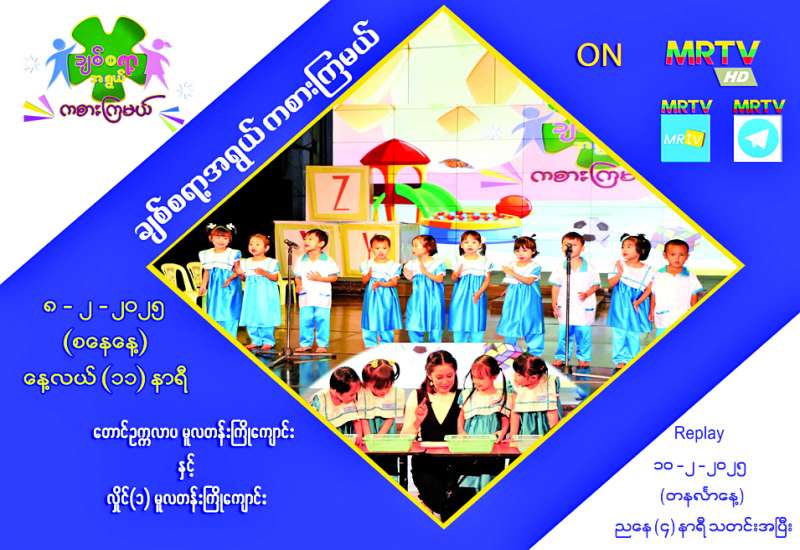 “ချစ်စရာ့အရွယ်ကစားကြမယ်” ကလေးအစီအစဉ်ကို MRTV HD Channelမှ အပတ်စဉ် စနေနေ့တိုင်းထုတ်လွှင့်ပြသလျက်ရှိရာ ဖေဖော်ဝါရီ ၈ ရက် စနေနေ့ မွန်းလွဲ ၁၁ နာရီတွင် ရန်ကုန်မြို့ တောင်ဥက္ကလာပ မူလတန်းကြိုကျောင်းနှင့် လှိုင်(၁)မူလတန်းကြိုကျောင်းတို့မှ ကလေးငယ်များ ပါဝင်ကစားကြပုံများကို မြန်မာ့အသံနှင့်ရုပ်မြင်သံကြား၏ MRTV-HD Channelမှ ဆက်လက်ထုတ်လွှင့်ပြသမည်ဖြစ်သည်။