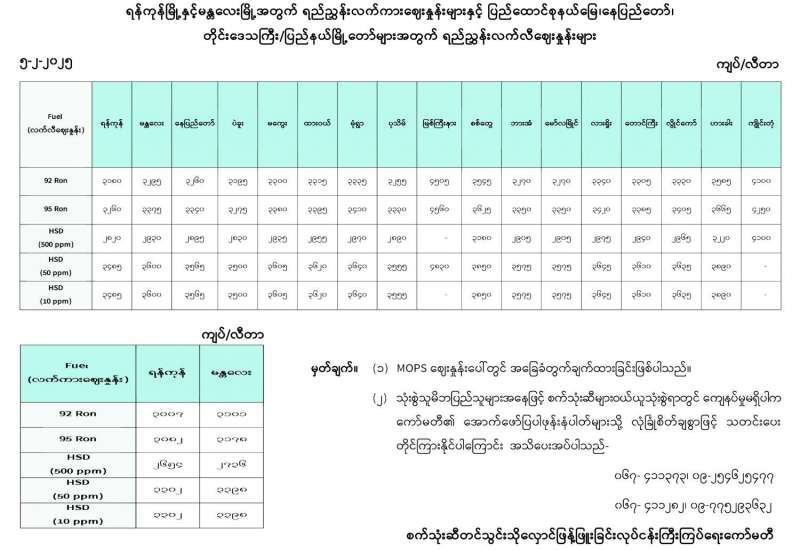 ရန်ကုန်မြို့နှင့် မန္တလေးမြို့အတွက် ရည်ညွှန်းလက်ကားဈေးနှုန်းများနှင့် ပြည်ထောင်စုနယ်မြေ နေပြည်တော်၊ တိုင်းဒေသကြီး/ပြည်နယ် မြို့တော်များအတွက် ရည်ညွှန်းလက်လီဈေးနှုန်းများ
