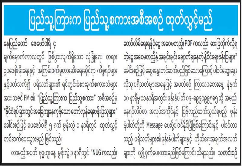 မျက်မှောက်ကာလတွင် ဖြစ်ပွားလျက်ရှိသော လုံခြုံရေး၊ တရားဥပဒေစိုးမိုးရေးနှင့် အကြမ်းဖက်မှုတားဆီးရေးဆိုင်ရာ ကိစ္စရပ်များနှင့်ပတ်သက်၍ ပရိသတ်များ၏ ရင်တွင်းခံစားချက်စကားသံများအား သဇင် FM ၏ “ပြည်သူ့ကြားက ပြည်သူ့စကား” အစီအစဉ်မှ “နိုင်ငံရပ်ခြားတွင် အခြေကျနေကုန်သော တော်လှန်ရေးဗန်းပြသူများ” ခေါင်းစဉ်ဖြင့် ဖေဖော်ဝါရီ ၅ ရက် မွန်းလွဲ ၁ နာရီတွင် ထုတ်လွှင့်တင်ဆက်ပေးသွားမည်ဖြစ်သည်။