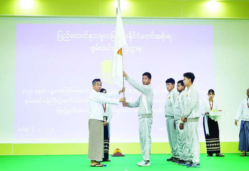 ၂၀၂၄ ခုနှစ် ပဉ္စမအကြိမ် အမျိုးသားအားကစားပွဲတော်၌ ဝင်ရောက်ယှဉ်ပြိုင်မည့် စွမ်းအင်ဝန်ကြီးဌာနကိုယ်စားပြု အားကစားအဖွဲ့အား အောင်နိုင်ရေးအလံအပ်နှင်းခြင်းအခမ်းအနားကို ယနေ့နံနက်ပိုင်းက စွမ်းအင်ဝန်ကြီးဌာန ရုံးအမှတ်(၆) ရတနာခန်းမ၌ကျင်းပရာ စွမ်းအင်ဝန်ကြီးဌာန ပြည်ထောင်စုဝန်ကြီး ဦးကိုကိုလွင် တက်ရောက်၍ အောင်နိုင်ရေးအလံကို အပ်နှင်းသည်။