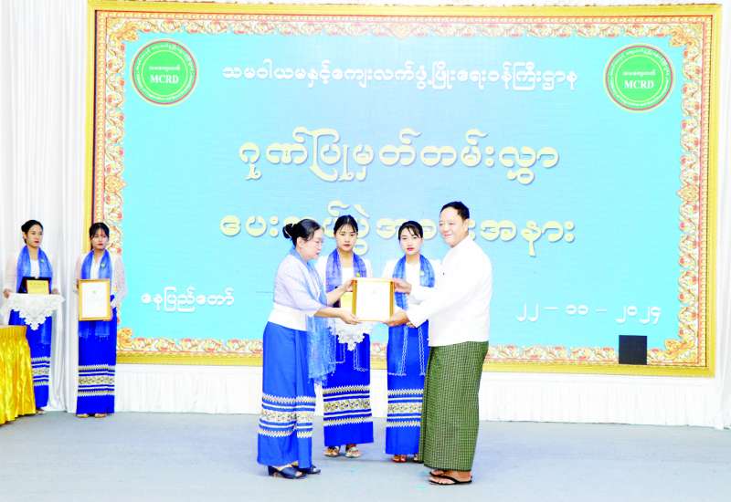 ရာဂီမုန်တိုင်းဒဏ်ကြောင့် ပြည်ထောင်စုနယ်မြေနေပြည်တော်အတွင်း သဘာဝဘေးဖြစ်ပွားခဲ့ပြီး ရေဘေးကယ်ဆယ်ရေးလုပ်ငန်းများနှင့် ပြန်လည်ထူထောင်ရေးလုပ်ငန်းများတွင် ပါဝင်ကူညီဆောင်ရွက်ခဲ့သော သမဝါယမနှင့် ကျေးလက်ဖွံ့ဖြိုးရေးဝန်ကြီးဌာနမှ ဝန်ထမ်းများအား ဂုဏ်ပြုမှတ်တမ်းလွှာပေးအပ် ပွဲအခမ်းအနားကို ယနေ့နံနက်ပိုင်းက ဝန်ကြီးဌာန စုပေါင်းအစည်းအဝေးခန်းမ၌ကျင်းပရာ ပြည်ထောင်စုဝန်ကြီး ဦးလှမိုး၊ ဒုတိယဝန်ကြီး ဦးမြင့်စိုးနှင့် တာဝန်ရှိသူများ၊ ဝန်ထမ်းများ တက်ရောက်ကြသည်။