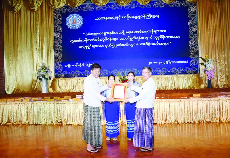 ပုဂံရှေးဟောင်းယဉ်ကျေးမှုအမွေအနှစ်ဒေသအတွင်း ရေကြီးရေလျှံမှုများ ထပ်မံမဖြစ်ပေါ်စေရေးနှင့် ရေစီးရေလာကောင်းမွန်စေရေးအတွက် ရေလမ်းကြောင်းများဖော်ထုတ်ခြင်းနှင့် ရှေးဟောင်းရေကန် ၉၁ ကန်အား ပြန်လည်တူးဖော်ထိန်းသိမ်းကန်ဆယ်ခြင်းလုပ်ငန်းများကို ဆောင်ရွက်နိုင်ရန် ဝိုင်းဝန်းကူညီဆောင်ရွက်ပေးကြသည့် ဝန်ကြီးဌာနများနှင့် ရေကန်အလှူရှင်များအား ဂုဏ်ပြုမှတ်တမ်းလွှာပေးအပ်ပွဲအခမ်းအနားကို ယနေ့တွင် အမျိုးသားပြတိုက် (ရန်ကုန်) ဘက်စုံခန်းမ၌ ကျင်းပရာ သာသနာရေးနှင့်ယဉ်ကျေးမှုဝန်ကြီးဌာန ပြည်ထောင်စုဝန်ကြီး ဦးတင်ဦးလွင်၊ ရန်ကုန်တိုင်းဒေသကြီးဝန်ကြီးများနှင့် တာဝန်ရှိသူများ၊ ရေကန်အလှူရှင်များ တက်ရောက်ကြသည်။