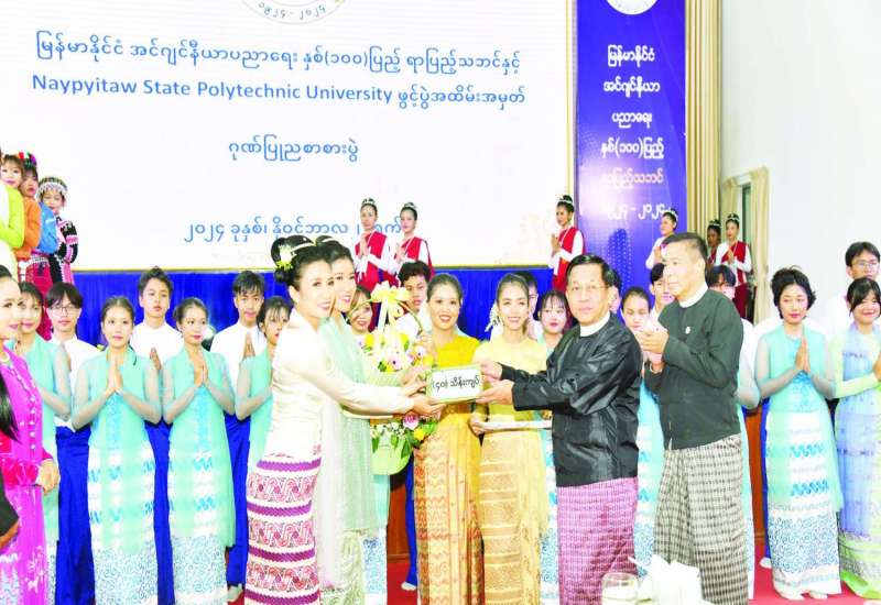 မြန်မာနိုင်ငံ အင်ဂျင်နီယာပညာရေးနှစ်(၁၀၀)ပြည့် ရာပြည့်သဘင်နှင့် Naypyitaw State Polytechnic University ဖွင့်ပွဲအထိမ်းအမှတ် ဂုဏ်ပြုညစာစားပွဲအခမ်းအနားကို ယနေ့ညနေပိုင်းတွင် အဆိုပါတက္ကသိုလ်၌ကျင်းပပြုလုပ်ရာ နိုင်ငံတော်စီမံအုပ်ချုပ်ရေးကောင်စီဥက္ကဋ္ဌ နိုင်ငံတော်ဝန်ကြီးချုပ် ဗိုလ်ချုပ်မှူးကြီးမင်းအောင်လှိုင် တက်ရောက်ချီးမြှင့်သည်။