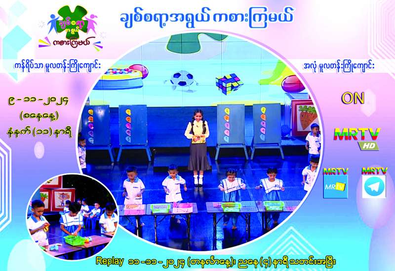 “ချစ်စရာ့အရွယ်ကစားကြမယ်” ကလေးအစီအစဉ်ကို MRTV HD Channelမှ အပတ်စဉ် စနေနေ့တိုင်း ထုတ်လွှင့်ပြသလျက်ရှိရာ ၂၀၂၄ ခုနှစ် နိုဝင်ဘာ ၉ ရက် (စနေနေ့) နံနက် ၁၁ နာရီတွင် ကန်ရိပ်သာမူလတန်းကြိုကျောင်းနှင့် အလုံမူလတန်းကြိုကျောင်းတို့မှ ကလေးငယ်များ ပါဝင်ကစားကြပုံများကို မြန်မာ့အသံနှင့် ရုပ်မြင်သံကြား၏ MRTV-HD Channelမှ ဆက်လက်ထုတ်လွှင့်ပြသမည်ဖြစ်သည်။