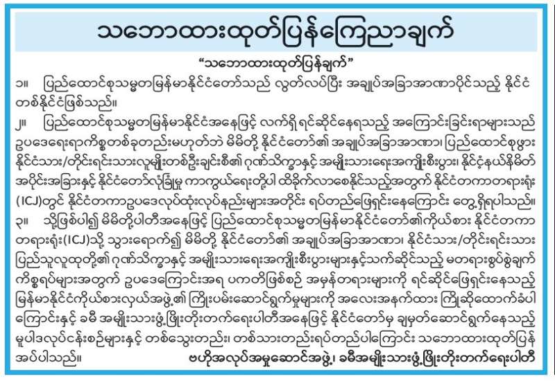 ၂၀၂၀ ပြည့်နှစ် ရွေးကောက်ပွဲတွင် မဲမသမာမှုများနှင့် ဖွဲ့စည်းပုံအခြေခံဥပဒေ (၂၀၀၈ ခုနှစ်) ကို သွေဖည်ပြီး နိုင်ငံတော်အာဏာကို အဓမ္မရယူရန် ကြိုးပမ်းမှုများကြောင့် တပ်မတော်က နိုင်ငံတော်တာဝန်ကို ခေတ္တရယူပြီး ချမှတ်ခဲ့သည့် ကတိကဝတ်များနှင့်အညီ ပါတီစုံဒီမိုကရေစီအထွေထွေရွေးကောက်ပွဲကို လွတ်လပ်၍ တရားမျှတစွာ ပြန်လည်ကျင်းပပေးခဲ့သည်။ တရားမျှတသည့် ရွေးကောက်ပွဲရလဒ်နှင့်အညီ နိုင်ငံတော်အာဏာကို လွှဲပြောင်းပေးအပ်မည်ဖြစ်သည်။